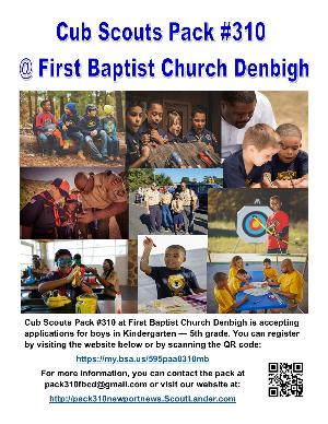 Cub Scouting is a program of the Boy Scouts of America (BSA), whose overall mission is to help young people build character, learn citizenship, and develop personal fitness. While the BSA serves boys and girls from ages 5 through 20, Cub Scouting focuses on youth ages 5 to 10. Cub Scout Pack #310 is currently accepting applications for boys only in Kindergarten thru the 5th grade. We meet regularly at First Baptist Church Denbigh in Newport News, Virginia. If you have any questions, feel free to contact us by using the Contact Our Pack link. One of the pack leaders will respond to you as soon as possible.